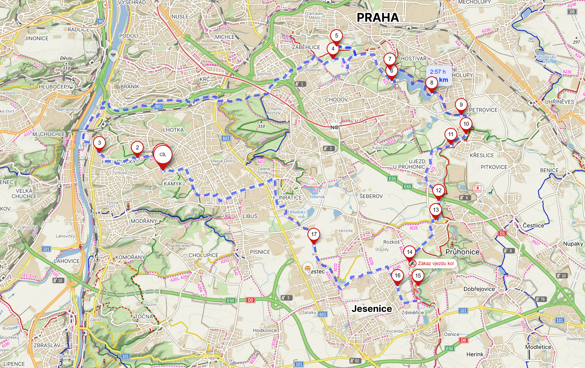 Začátek trasy začíná podél Vltavy a následně se odbočí a projede se po cyklotrase podél desítek hřišť až se dorazí do Kunratického lesa. Po větším stoupání v Kunratickém lesu musíme přibližně 2 kilometry projet uličkami Prahy a pak se opět dostáváme na cyklotrasu kde následně jedeme podél celé Hostivařské přehrady. Zde bývá spousta lidí takže si musíme dát pozor abychom neměli nehodu.