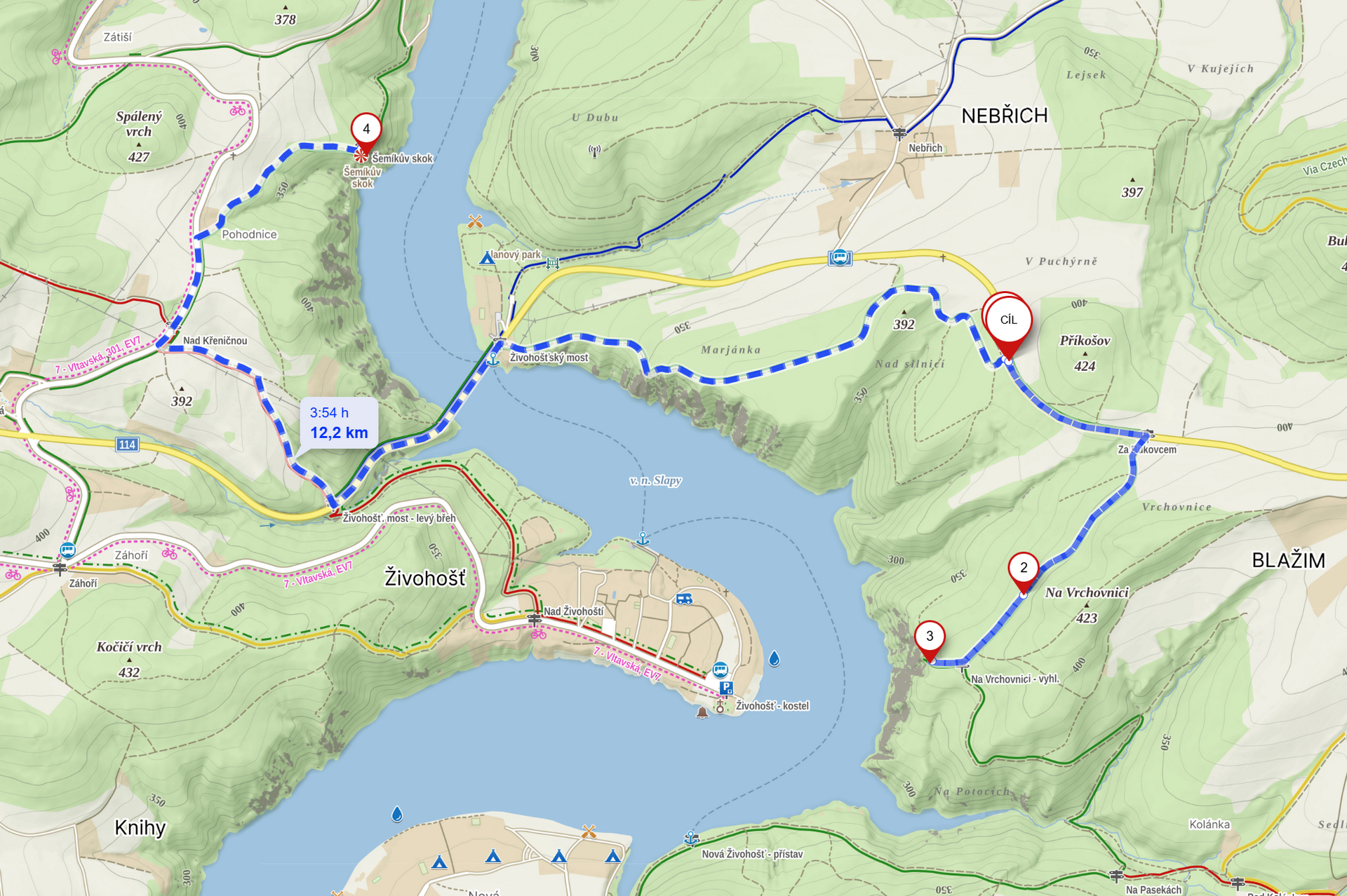 Aby jsme viděli meandr z obou stran dojdeme si nejdříve na vyhlídku naproti poloostrovu Živohošť a následně buď popojedeme autem nebo podél silnice přes most a na výhled s názvem Šemíkův skok.
